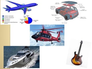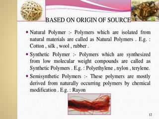 Synthetic polymers are widely used as substitutes for materials like metals, wood, cotton and glass. They have properties like low density, resistance to chemicals, flexibility and the ability to be molded into different shapes. Common synthetic polymers include polyethylene, polyester, nylon and polypropylene. Polymers can be thermoplastics, which soften when heated and harden when cooled, allowing reshaping, or thermosets, which remain rigid. Conductive polymers can transport electricity through conjugated pi electrons on their backbone, making them semiconductors when doped. Applications include medical devices, packaging and conductive fabrics.
