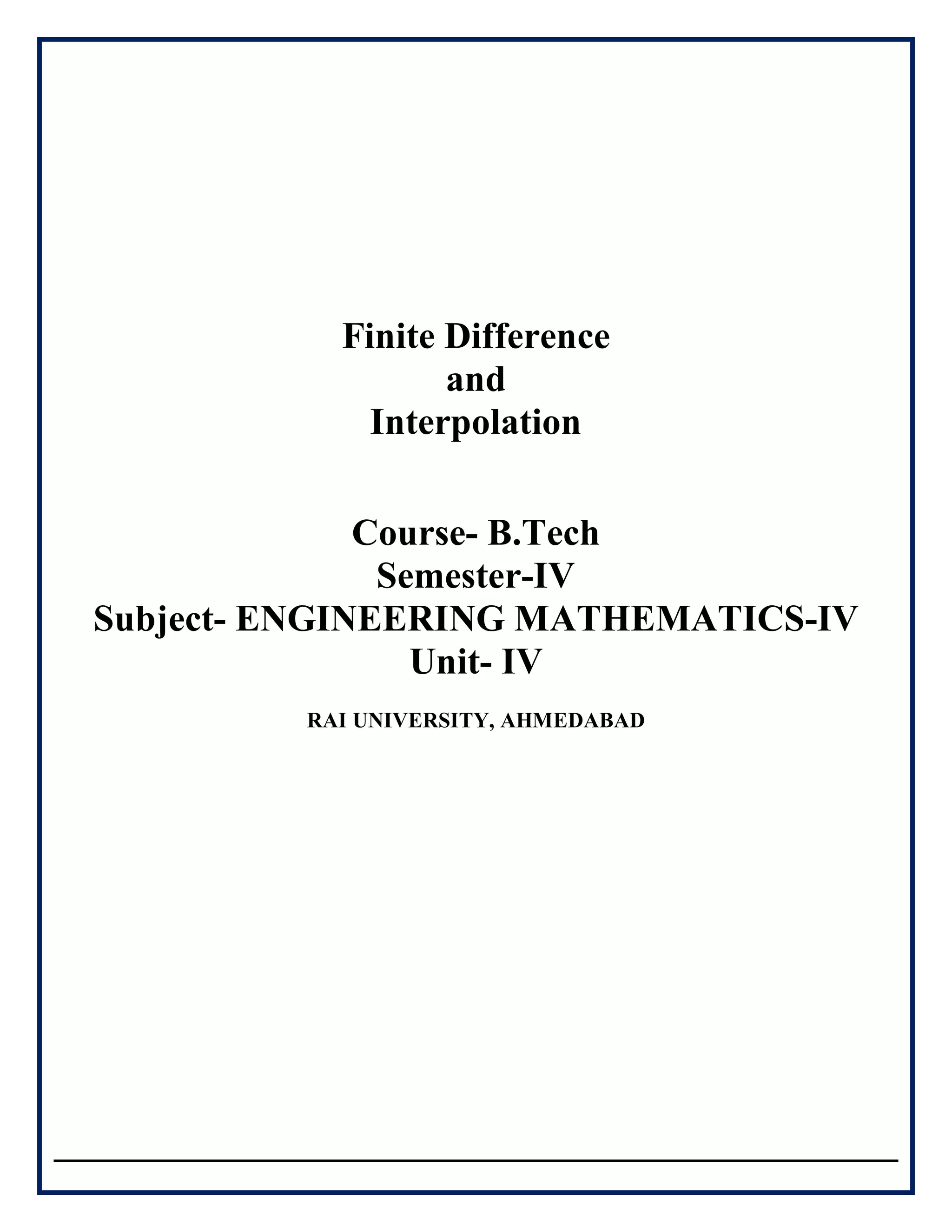 This document discusses finite difference and interpolation methods. It covers topics like finite differences, difference tables, Newton's forward and backward interpolation formulas, Stirling's interpolation formula, Newton's divided difference formula for unequal intervals, and Lagrange's divided difference formula for unequal intervals. Examples are provided to demonstrate calculating finite differences, constructing difference tables, and using interpolation formulas to estimate values between given data points.