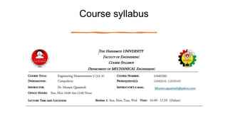 This document outlines the syllabus for an engineering measurement course taught by Dr. Momen Qasaimeh in the summer of 2023/2024. The course will introduce students to electronic instrumentation systems used to make accurate measurements of mechanical and thermal quantities. It will cover topics such as the process of measurement, components of measurement systems, sensor and transducer types, standards and calibration procedures. The primary textbook will be "Mechanical Measurements" 6th edition by Thomas G. Beckwith.