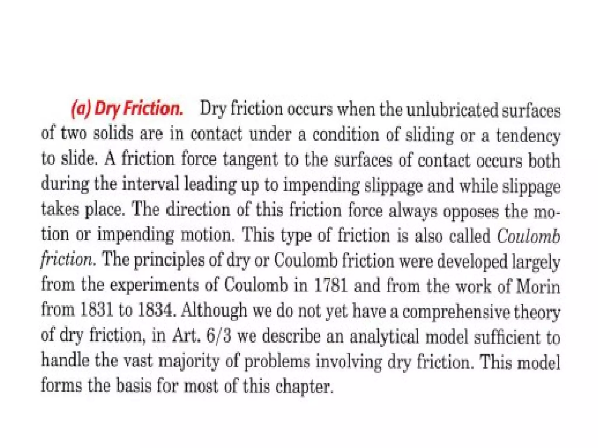 This document discusses friction. It defines friction as the tangential forces that develop between two surfaces in contact when one attempts to move relative to the other. These friction forces oppose relative motion. Static friction acts when surfaces are at rest, and can be up to a maximum value determined by the normal force and coefficient of static friction. Kinetic friction acts when surfaces are sliding and depends on the normal force and coefficient of kinetic friction. The coefficients of friction describe the maximum static friction and typical kinetic friction between two surfaces, and are proportional to the normal force but independent of contact area. The document also discusses the angles of friction and provides examples of problems involving dry friction.