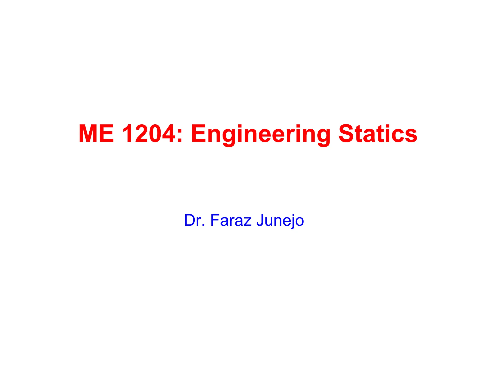 This document outlines the key concepts and objectives covered in the Engineering Statics course ME 1204. It discusses rigid bodies and the conditions required for rigid-body equilibrium. Namely, the net force and net moment about any point must equal zero. Free-body diagrams are introduced as a way to visualize all external forces and reactions acting on a body. The equations of equilibrium - the sum of forces in the x and y directions and the sum of moments about a point must equal zero - are provided to analyze rigid bodies in static equilibrium. Examples are given to demonstrate applying these concepts to solve equilibrium problems.