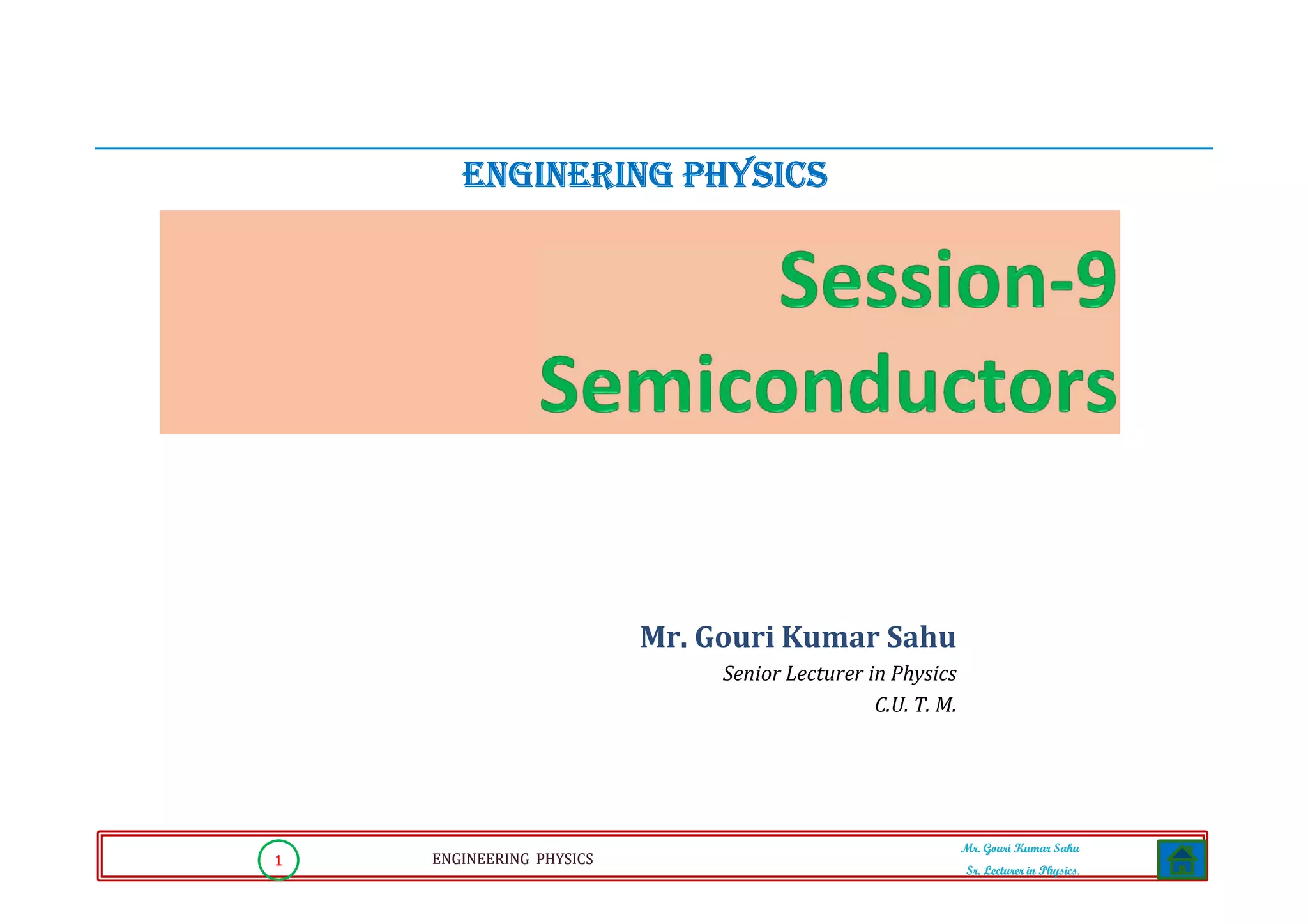 This document discusses semiconductors and is presented by Mr. Gouri Kumar Sahu, a senior lecturer in physics. It covers different types of semiconductors including elemental, compound, ternary and quaternary semiconductors. Semiconductors are classified as either pure/intrinsic or doped/extrinsic. Pure semiconductors have a small number of electrons that participate in conduction due to thermal energy. This leaves behind holes which act as positively charged carriers. Examples given are silicon and germanium.