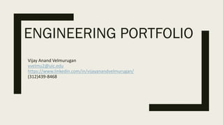 Vijay Anand Velmurugan is a graduate student in Mechanical Engineering at UIC specializing in Mechanical Design and Mechatronics. He has 2.5 years of experience as a design engineer at Volvo Group handling projects from concept to production. He has a proven track record of managing diverse, global projects for Volvo trucks. His portfolio highlights experience in product design and development, CAD software, finite element analysis, and cost improvement programs.