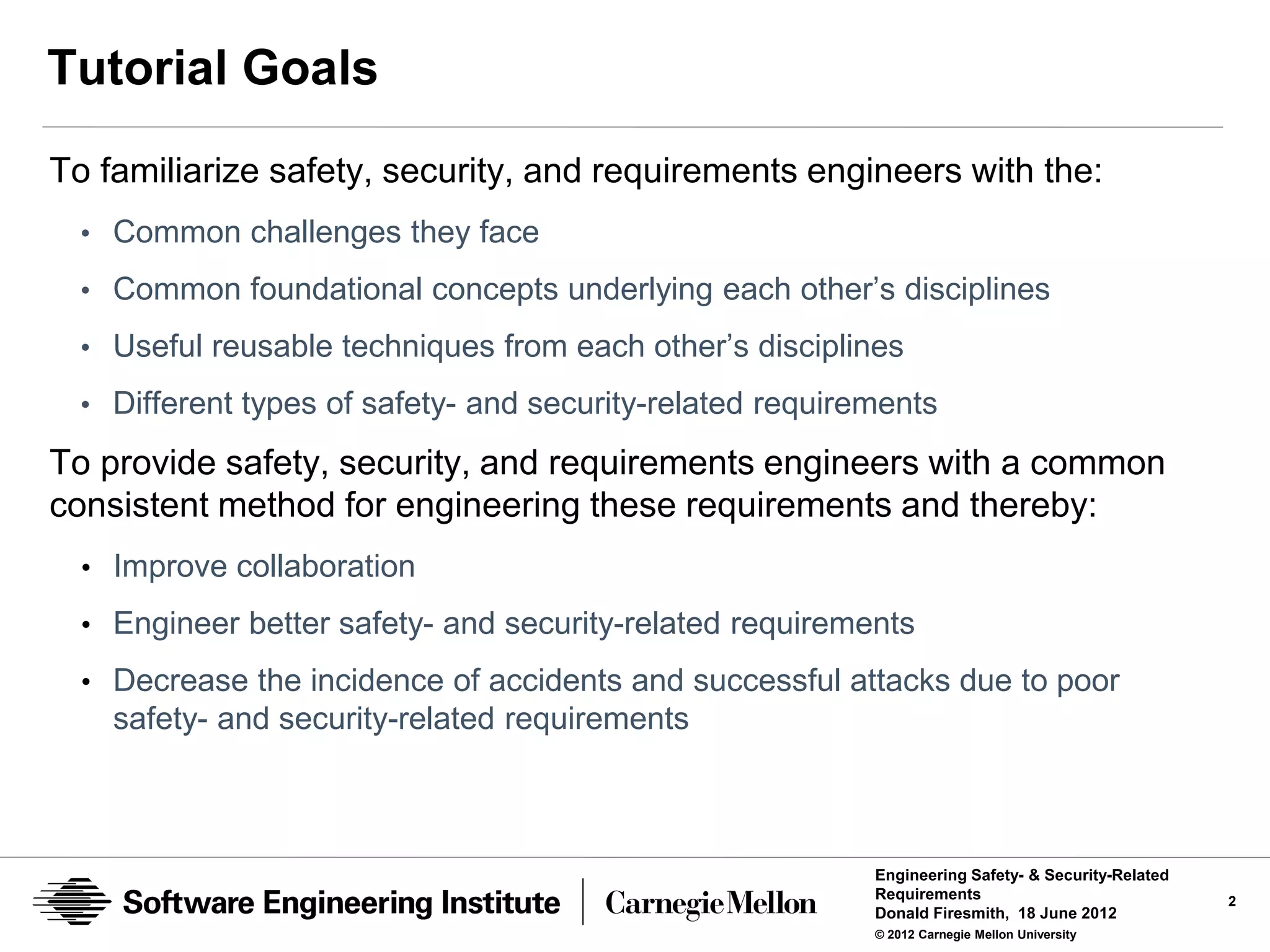 The document presents a tutorial aiming to bridge the gap between safety, security, and requirements engineering by highlighting common challenges and offering reusable techniques to improve collaboration and requirement quality. It addresses the inefficiencies of treating safety and security as separate disciplines and emphasizes the need for a unified approach to prevent accidents and successful attacks. A free open-source tool is introduced to support this integrated method, with practical examples provided for its application.