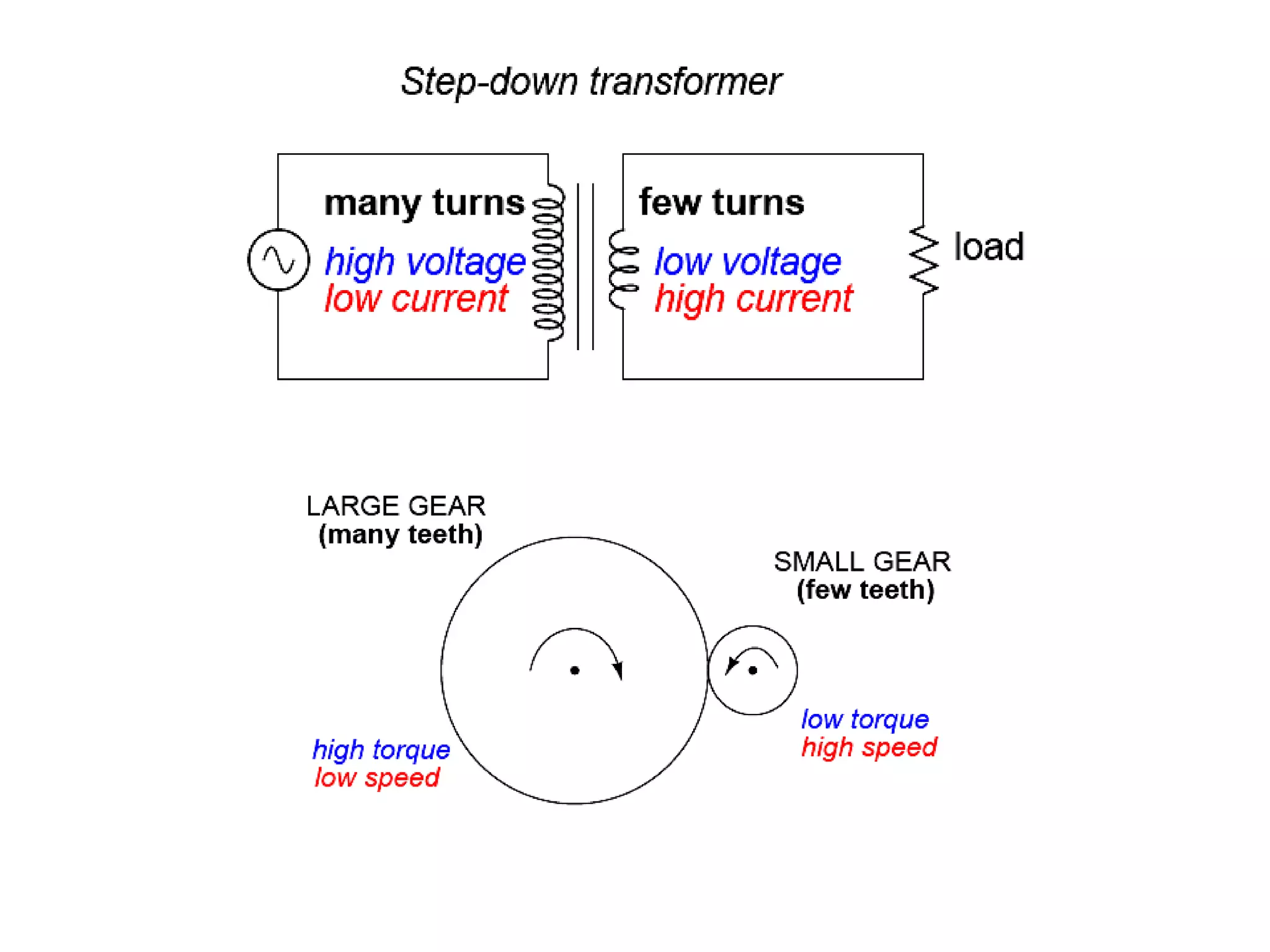 3) The voltage and current ratios between primary and secondary coils are determined by their relative turn ratios; this relationship allows impedances to be transferred between sides.