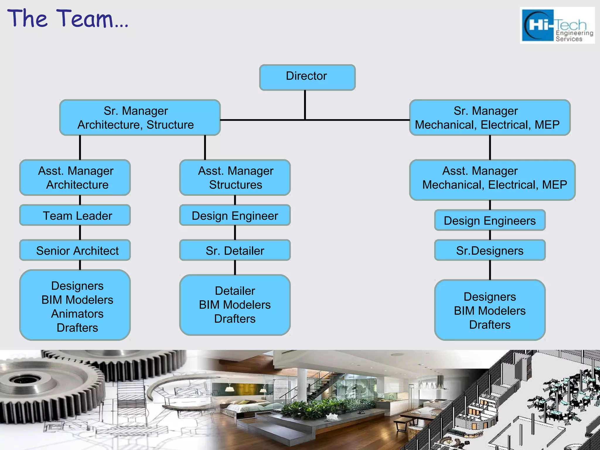 The document outlines an engineering services outsourcing team structure and their resource capabilities in architecture, structure, mechanical, electrical, and MEP disciplines. It includes details about team roles, software skills ratings, and specific architectural and engineering services offered, such as BIM services, product modeling, and structural analysis. The document emphasizes the use of CAD technology for high-quality architectural renderings and comprehensive design documentation.