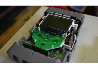 The NXT is a programmable robotics kit produced by Lego Mindstorms. It features a 32-bit main microprocessor and 8-bit microcontroller, input and output ports, an LCD screen, Bluetooth, speaker, and is powered by batteries. It can be programmed in many languages and uses sensors to read input and motors or servos for output. The NXT exposes concepts from an electronics class like flip-flops, AD/DA conversion, and microcontrollers. It aims to introduce children to programming, inspire creativity, and allow them to make simple helpful robots.