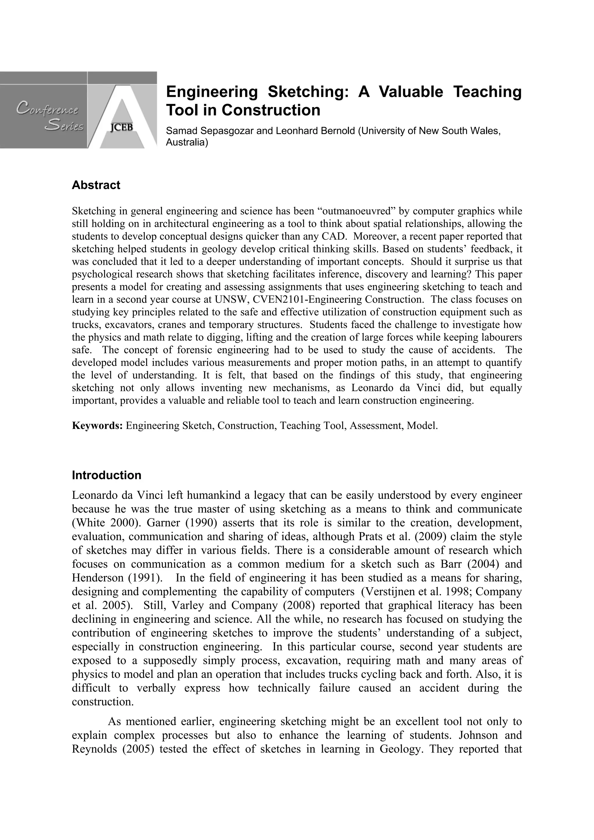 The paper discusses the use of engineering sketching as an effective teaching tool in a second-year construction engineering course at the University of New South Wales, highlighting its role in enhancing students' understanding of complex concepts related to construction systems and safety. It outlines the development of an assessment model, the Engineering Sketching for Teaching and Learning (ESTL), which aims to improve students' skills through peer-reviewed sketching assignments. The study concludes that sketching not only aids in conceptualizing designs but also fosters critical thinking and deeper comprehension of engineering principles.