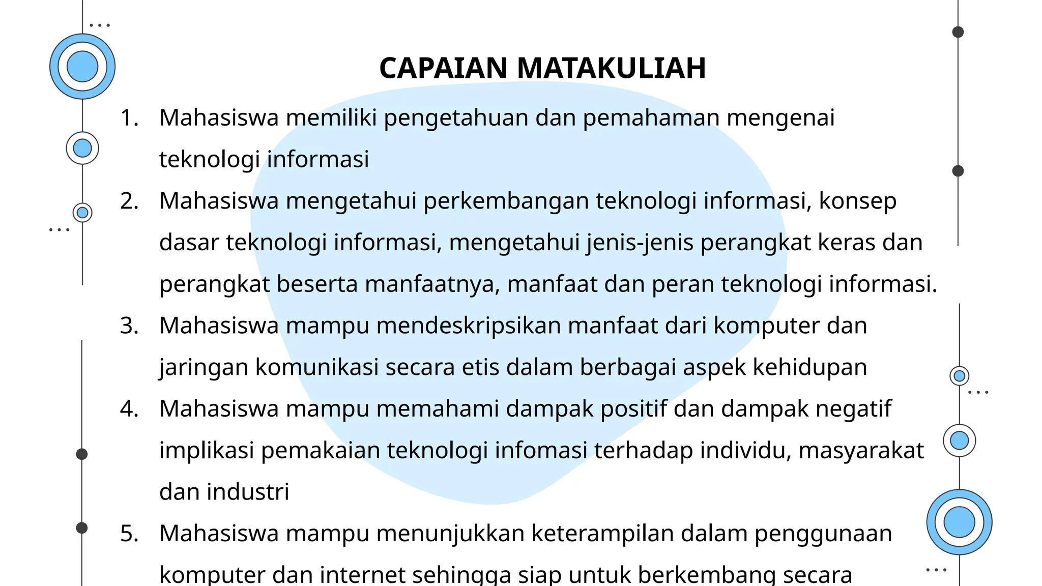 Dokumen ini membahas pengenalan teknologi informasi kepada mahasiswa, termasuk perkembangan dan dampak teknologi terhadap individu dan masyarakat. Ini juga mencakup sejarah revolusi industri dan definisi informasi serta teknik yang berkaitan dengan penggunaan teknologi dalam pendidikan. Mahasiswa diharapkan mampu menguasai keterampilan komputer dan internet dalam konteks belajar dan perkembangan jaringan informasi.
