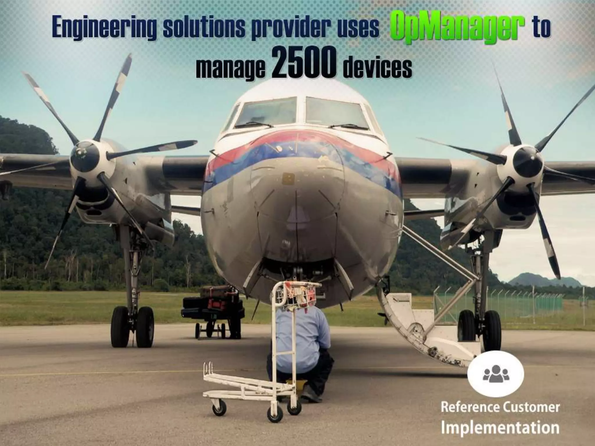 The document outlines the capabilities of a leader in communications, engineering, and systems integration, serving numerous critical infrastructures globally. It highlights the monitoring requirements and value provided by ManageEngine OpManager in managing network performance, including real-time change management, bandwidth analysis, and IP address management. The platform offers a centralized network management console that supports large scale operations and enhances visibility across network layers.