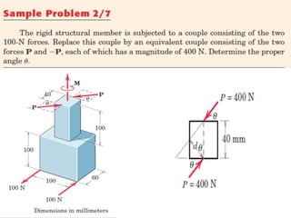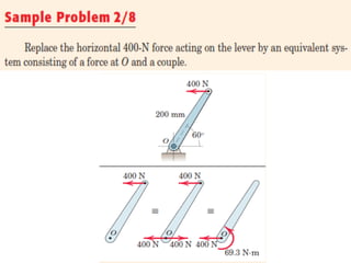 - Any system of forces on a rigid body can be replaced by a single force and couple. The principle of transmissibility allows treating forces as "sliding vectors".