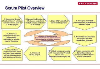 The document outlines the SCRUM pilot project aimed at developing mid-level high-potential engineers through a 30-day project managed using SCRUM methodology. The project involves identifying a business need, forming a SCRUM team, and following the SCRUM process which includes roles like Product Owner and Scrum Master, iterative sprints, and prioritized backlogs. Additionally, it discusses the impact of SCRUM compared to traditional methods, emphasizing adaptability, productivity, and continuous delivery of business value.