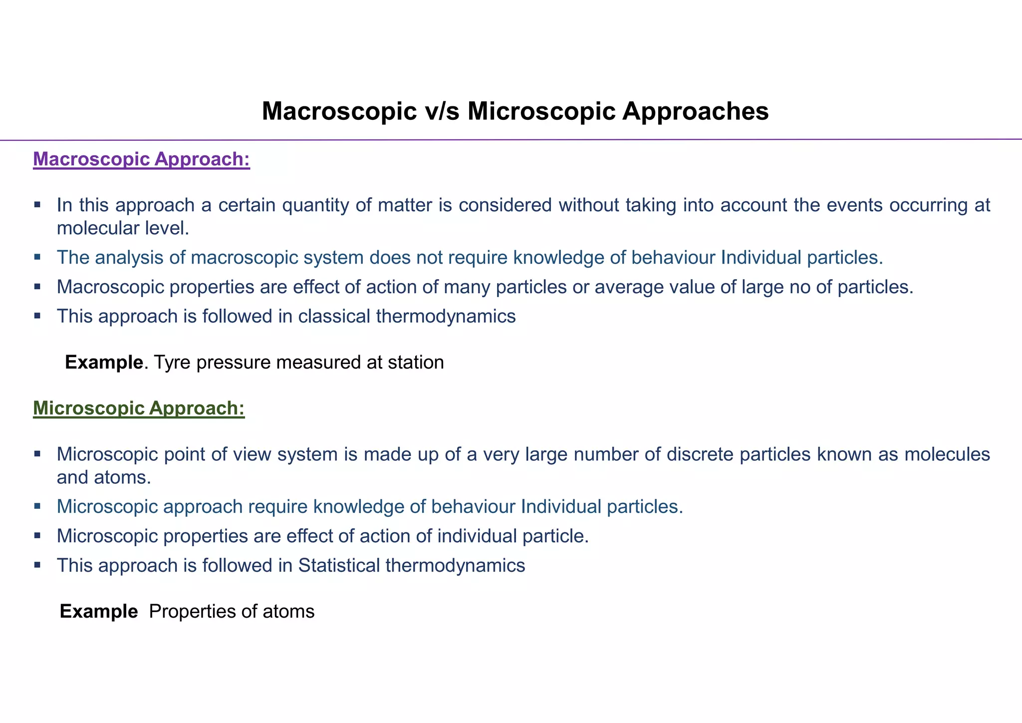 The document discusses macroscopic and microscopic approaches in engineering thermodynamics. The macroscopic approach considers bulk properties without analyzing individual particles, while the microscopic approach examines systems at the molecular level and requires understanding particle behavior. Examples are given of tire pressure measured macroscopically and atomic properties analyzed microscopically. A video link is also provided for further explanation of the key concepts.