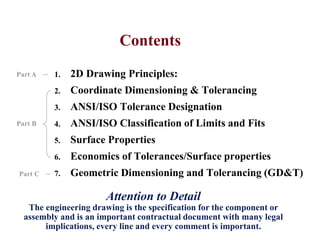 The document outlines principles of 2D engineering drawing, focusing on essential topics such as dimensioning, tolerancing, and the creation of detail and assembly drawings. It explains methods like orthographic projections and section views, emphasizing the importance of clarity and accuracy in technical drawings. Additionally, it covers practices like crosshatching for material differentiation and the use of cutting planes for internal detail representation.