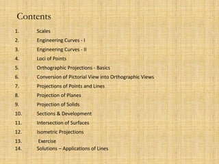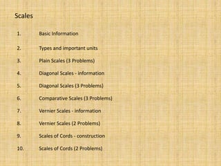 This document provides information on various types of engineering scales and their construction and applications. It discusses plain scales, which can measure dimensions up to a single decimal place, and provides examples of their construction and use. It also covers diagonal scales, which can measure up to two decimal places, and vernier scales, which also measure up to two decimal places. Comparative scales are described for comparing different units, and scales of cords are introduced for measuring and constructing angles. Construction techniques and example problems are provided for different scale types. The document serves as a reference for understanding and applying various engineering scales.
