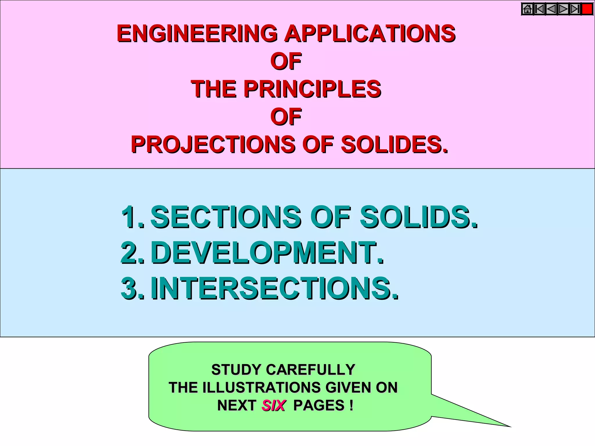 This document discusses sections and developments of solids. It begins by defining sectioning of a solid as cutting it with an imaginary cutting plane to understand its internal details. The cutting plane is called the section plane. It then discusses different types of section planes and their appearances in projections. Later it defines development as unfolding the lateral surfaces of a hollow solid to show its total surface area as a 2D shape. Various engineering applications of developments are listed. The document provides examples of typical section planes and shapes, and methods for developing different solids, sections and frustums. It concludes with sample problems demonstrating how to draw sections, developments and true shapes of cut solids.