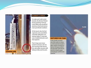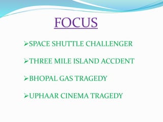 The document discusses several engineering disasters including the Space Shuttle Challenger explosion, Three Mile Island nuclear accident, Bhopal gas tragedy, and Uphaar Cinema fire. It summarizes the key events and identifies technical failures, lack of safety protocols, cost-cutting measures, and human errors as contributing factors. The document emphasizes engineers' responsibility to consider safety and protect public welfare.