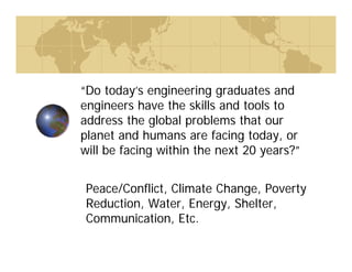 This document discusses the need for engineering graduates and engineers to have skills to address global problems related to peace, climate change, poverty reduction, water, energy, shelter, and communication. It notes that billions of people currently lack access to clean water, adequate sanitation, electricity, adequate housing, and more. The document advocates for developing engineers who can help meet basic human needs and live with dignity through appropriate and sustainable engineering solutions. It provides examples of organizations doing this kind of work and discusses attributes needed in engineers of the future, such as strong analytical skills, practical ingenuity, creativity, and global awareness.