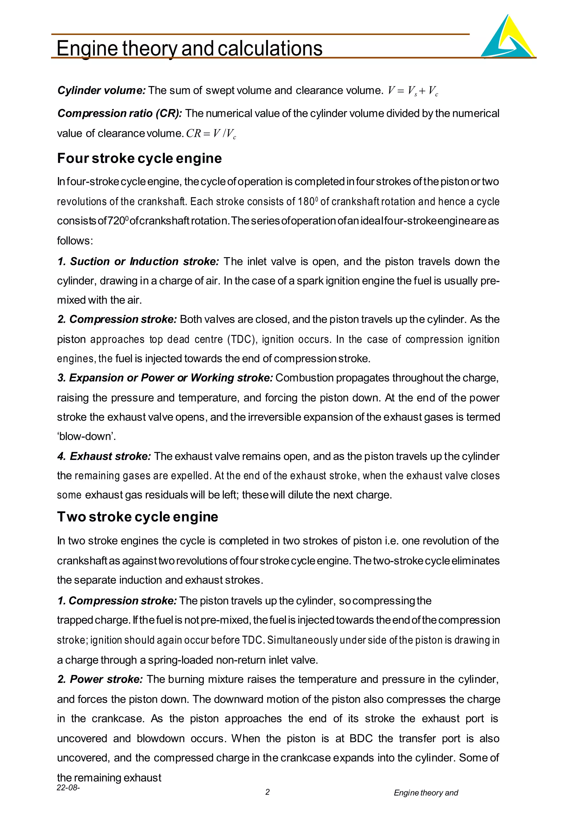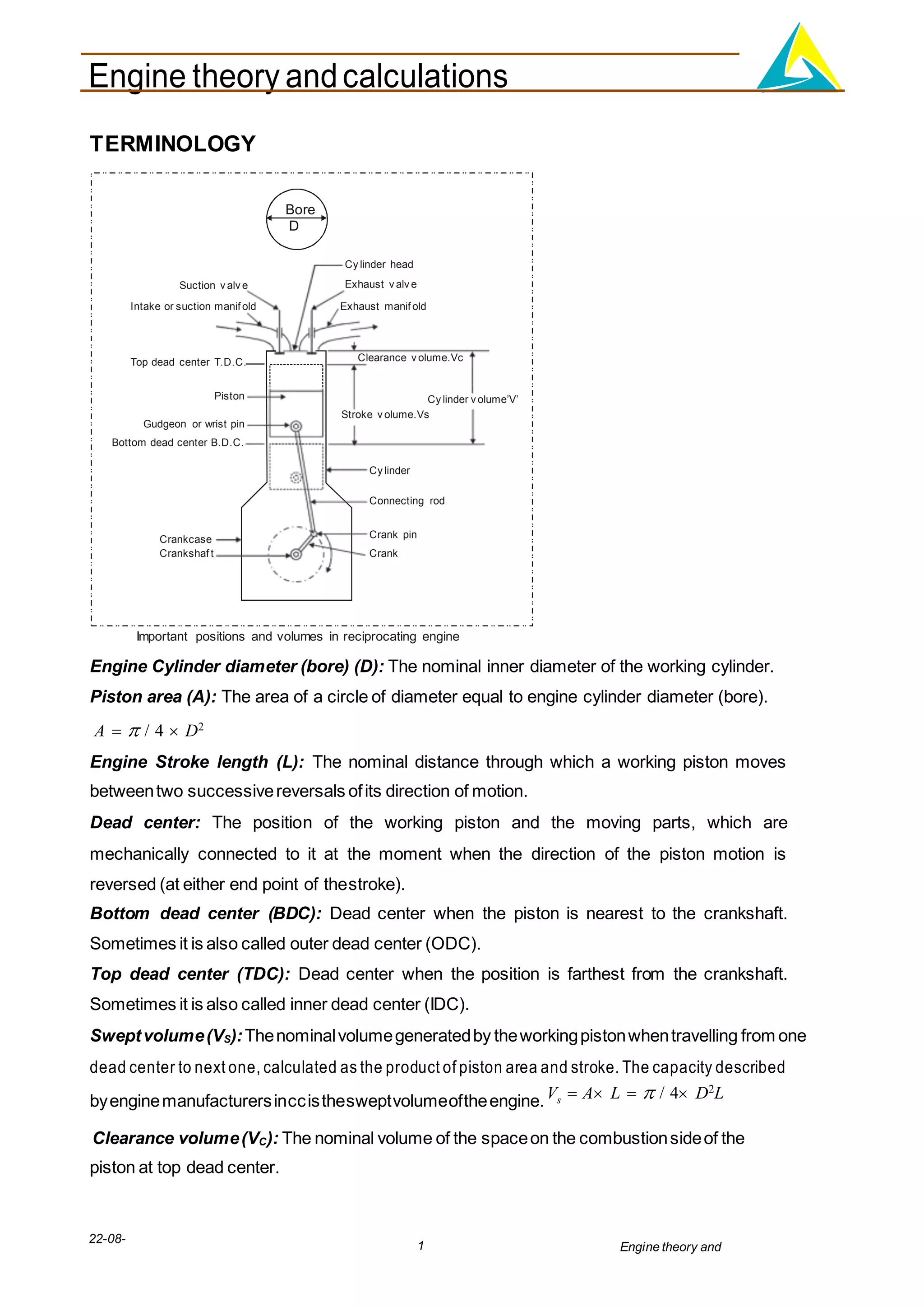 2. Key engine parameters - bore, stroke, swept volume, clearance volume, compression ratio.