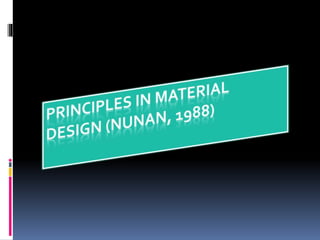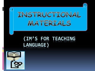 This document provides an overview of instructional materials (IMs) for teaching English. It defines IMs and discusses their roles and functions. IMs serve as the basis for language input and practice in the classroom. They can provide specifications for content and define learner and teacher roles. The document also examines factors to consider in developing IMs, such as understanding, structuring content clearly, sequencing material appropriately, and balancing elements. Different types of IMs are described, including textbooks, workbooks, and multimedia materials.