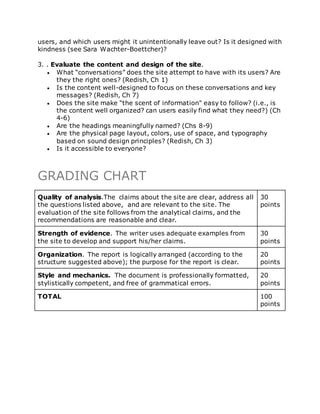 This document provides the description and requirements for Project 1 of an English course. Students are asked to analyze a website or app by applying concepts from course readings. The analysis should be in a Google Doc combining text and screenshots. It must address the site's goals, intended users, user assumptions, kindness, content conversations, organization, design principles, and accessibility. The grading rubric evaluates the quality of analysis, evidence used, organization, and writing mechanics.