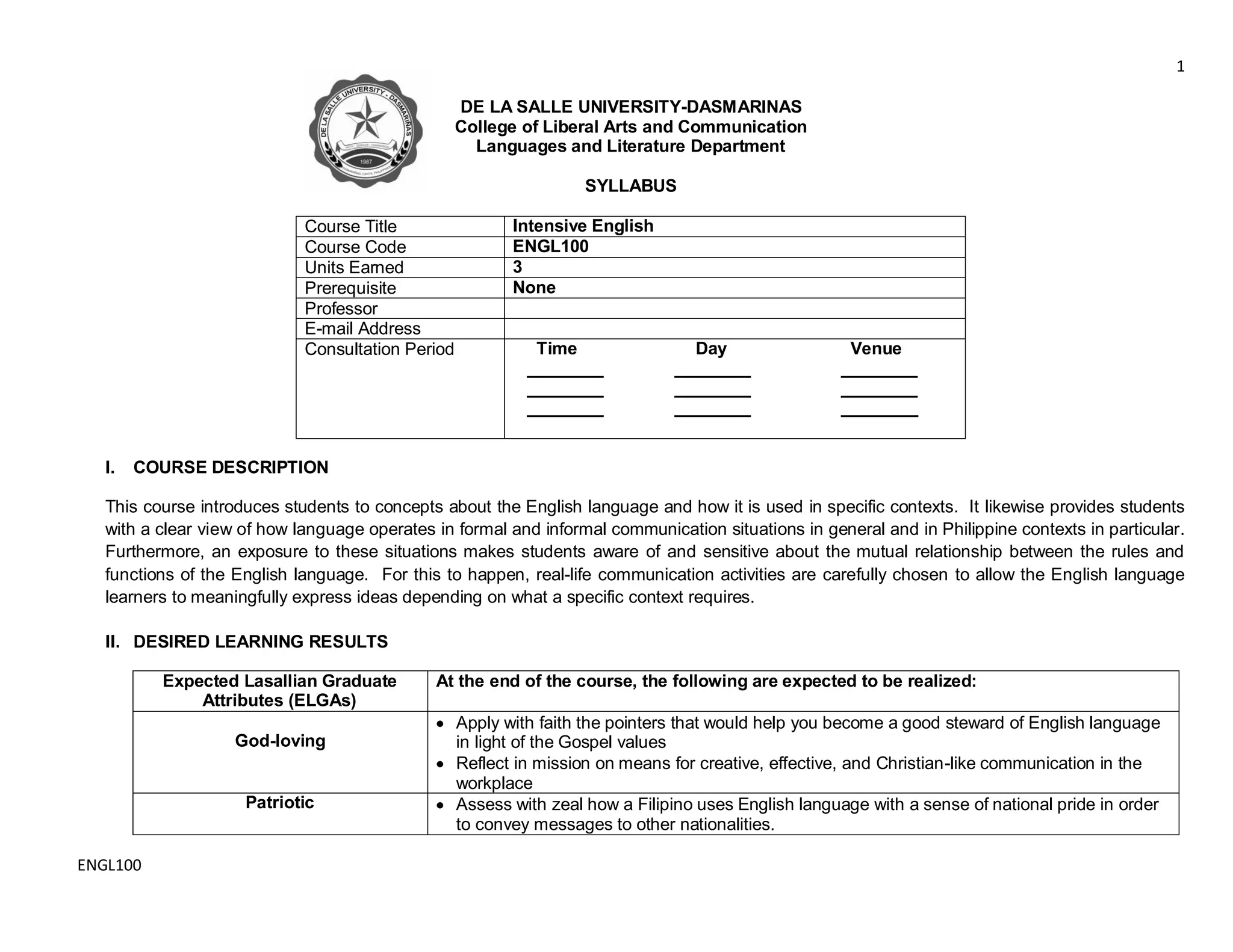 The syllabus outlines the course description, desired learning outcomes, final tasks, assessment criteria, learning plan, policies, and references for an Intensive English course that introduces concepts of the English language and provides exposure to formal and informal communication situations to develop awareness and sensitivity to the relationship between language rules and functions. Students will create an advocacy collateral and present it to demonstrate their English language ability and will write a brochure as their final task. The course aims to help students become good stewards of the English language with a sense of national pride and passion for excellence in communication.