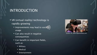 This document discusses the potential impacts of virtual reality (VR) technology on society. It explores how VR is being used positively in the military for training and in medicine for treatment, but could also have negative consequences such as dehumanization. While still in development, VR has promising applications and may significantly change society, but also raises debates around its technical and social effects. The document analyzes VR's origins, current uses, and potential to both improve conditions and negatively impact society.