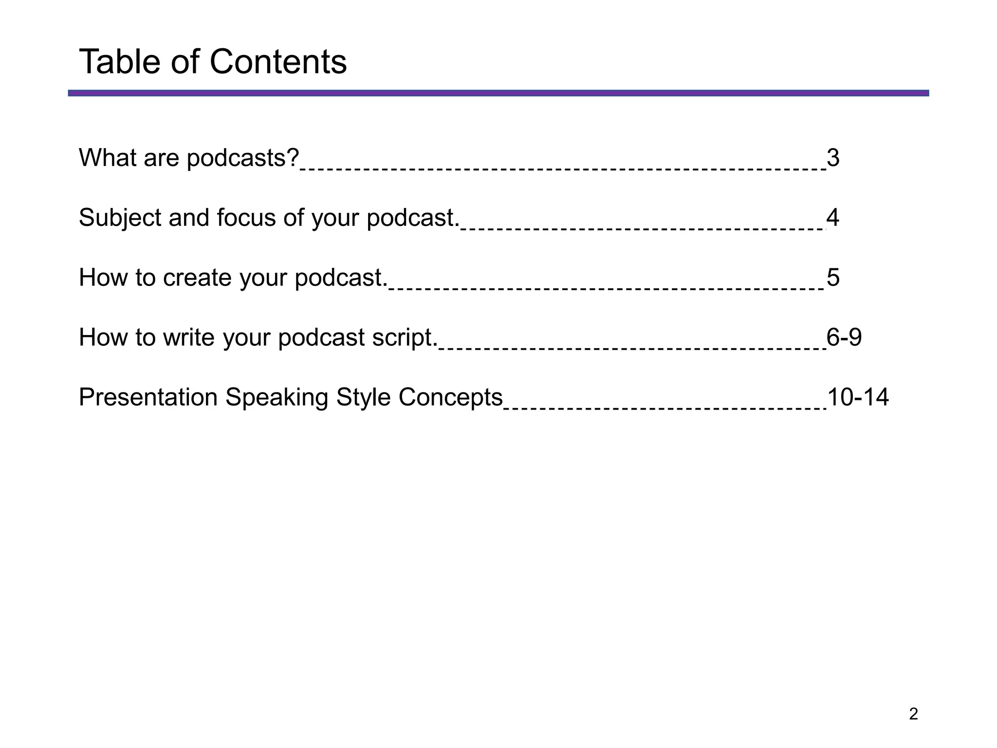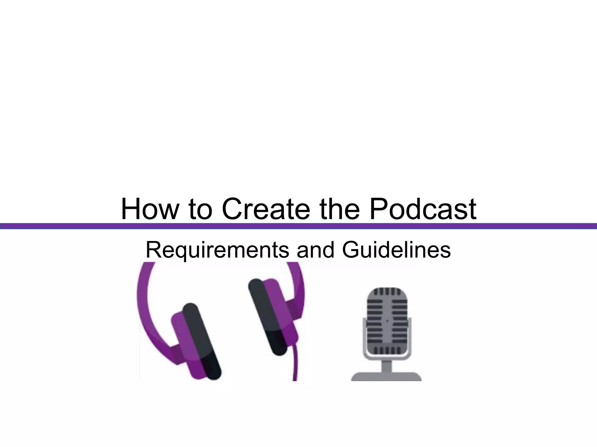 This document provides guidelines for creating a podcast on presentation speaking style concepts. It includes sections on what podcasts are, determining the subject and focus, how to create the podcast, how to write the script, and concepts to cover, including vocal variety, rate of speech, diction, pausing, and exercises. The key points are that the podcast should be audio-only, focus on presentation speaking style concepts, and be under 3 minutes to explain some concepts and suggest exercises for developing an effective speaking style.