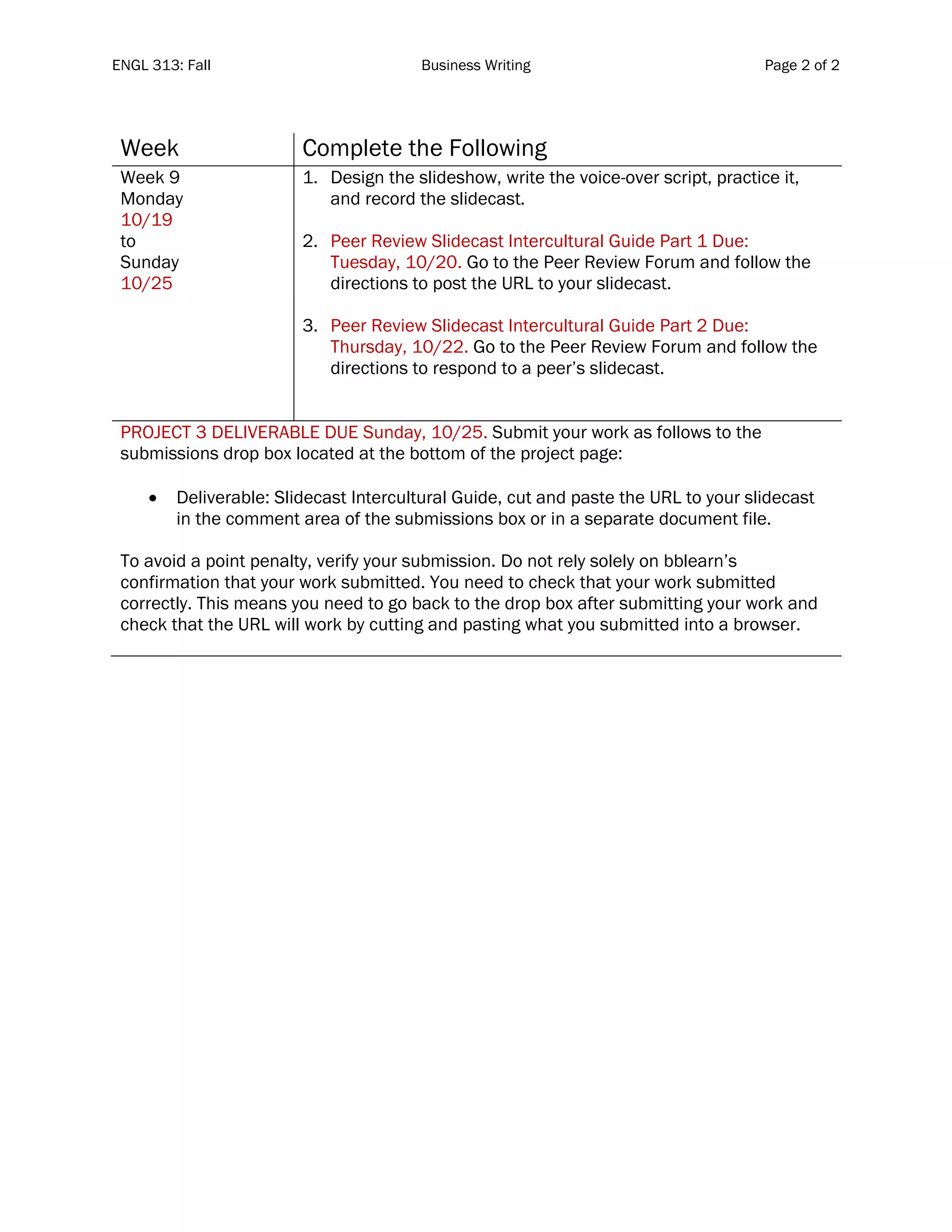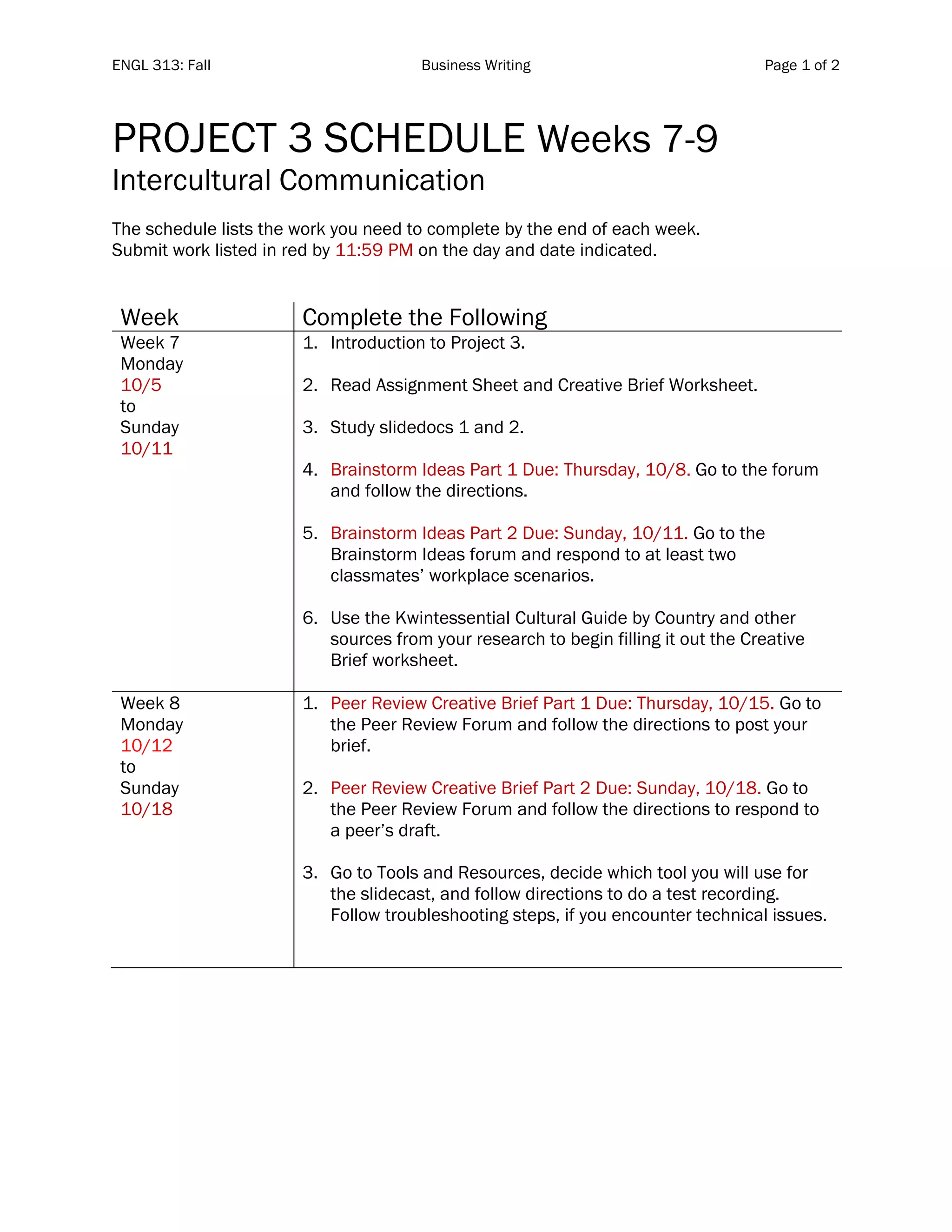 This document outlines the schedule and assignments for Project 3 of ENGL 313: Fall Business Writing. It lists the following key tasks to be completed over 3 weeks: