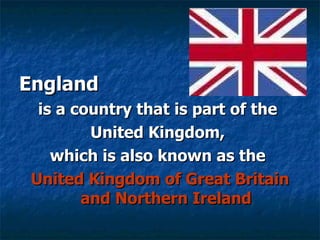 England is a country that is part of the United Kingdom located in northwestern Europe. It has a long history dating back to prehistoric times and has contributed significantly to science, literature, and sports. Some of its most prominent figures include Isaac Newton, Charles Darwin, William Shakespeare, and it is considered the birthplace of sports like football, cricket, and rugby.