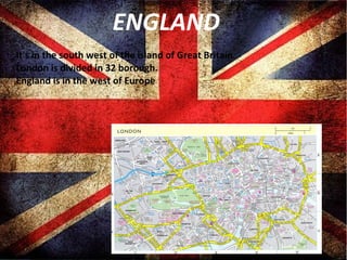 England is located in southwestern Great Britain and has a population of over 8 million people. London is the capital and largest city, divided into 32 boroughs. England has a monarchy form of government led by Queen Elizabeth II and borders Wales, Ireland, and Scotland. Some popular sports in England include cricket, football, rugby, and tennis. Famous landmarks to visit in London include Big Ben, London Eye, and Buckingham Palace.