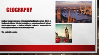 England comprises most of central and southern Great Britain and some small islands off the coast. It is bordered by Scotland to the north and Wales to the west. The capital of England is London. Typical English food includes dishes like toad in the hole, roast meats, fish and chips, and ploughman's lunch. Notable festivals are Guy Fawkes Night in November, commemorating an attempted assassination of King James I in 1605. The weather is often rainy. Famous monuments include Stonehenge and landmarks in London. The primary language is English. England has a long history of human habitation dating back over 800,000 years.