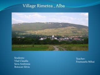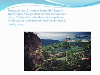 Rimetea is one of the most beautiful villages in Transylvania, known for its anthropogenic heritage including a 13th century fortress and the oldest working water mill in the Apuseni Mountains from 1752. The village museum contains over 11,000 objects reflecting local occupations like mining and woodworking. Rimetea is a popular destination for climbing, paragliding, and hiking due to its steep slopes and cliffs.