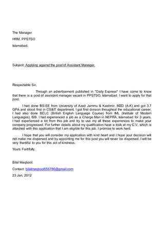 Bilal Maqbool is applying for the position of Assistant Manager at PPSTSO in Islamabad that was advertised in the Daily Express newspaper. He has a 3.7 GPA BS-SE degree from the University of Azad Jammu & Kashmir and received first division throughout his educational career. Bilal also has 3 years of experience working as a Charge Man at NEPRA in Islamabad. He believes his education and experience make him qualified for the Assistant Manager role and promises to work hard if selected. Bilal has attached his CV for further details of his qualifications and hopes his application will be considered favorably.