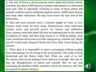 - The document is a reading comprehension exercise about conservation. It contains questions about a passage discussing the importance of conserving plants, animals, water and other natural resources.