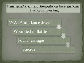 Ernest Hemingway was an American author known for works like A Farewell to Arms and The Old Man and the Sea. Some of his major themes involved the relationship between love and loss, as well as death. He explored how love could bring both happiness and sadness, as characters gained meaningful connections but also faced separation and loss.