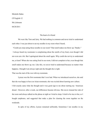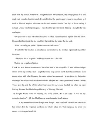 This document summarizes the author's experience with her first roommate in college. Initially, the author and her roommate Lynzee had many differences and conflicts over cleanliness and food smells. However, the author made continuous efforts to understand Lynzee's perspective and share her Korean culture, such as inviting Lynzee to try noodles. Over time, their relationship improved as they educated each other about their cultures. By the end of the year, Lynzee thanked the author for changing her view that Asians were unfriendly, and the author felt proud to be an ambassador for her culture. The author learned that making an effort to understand others can overcome initial reactions and judgments.