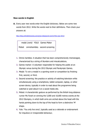 This document contains vocabulary exercises related to technology and future trends. It includes defining words related to searching online, social media, gaming and more. It also introduces new words that entered the English dictionary in 2012 such as "YOLO" and "omnishambles." There are exercises on phrasal verbs and a listening exercise about neighborhoods in East London, including Brick Lane, Whitechapel, Canary Wharf and Stratford. The document concludes with speaking questions to discuss a past holiday.