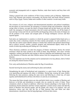 The Supreme Leader of Iran delivered a message to hajj pilgrims emphasizing unity among Muslims, recognizing enemies seeking to divide them, and learning lessons of humility, mercy and courage from the hajj experience. He warns that enemies like the US and Zionists are promoting discord and instability in countries to suppress Islamic awakening, and calls on Muslims to strengthen brotherhood, confront the true enemies' plots, and not let conflicts drag them back from progress.