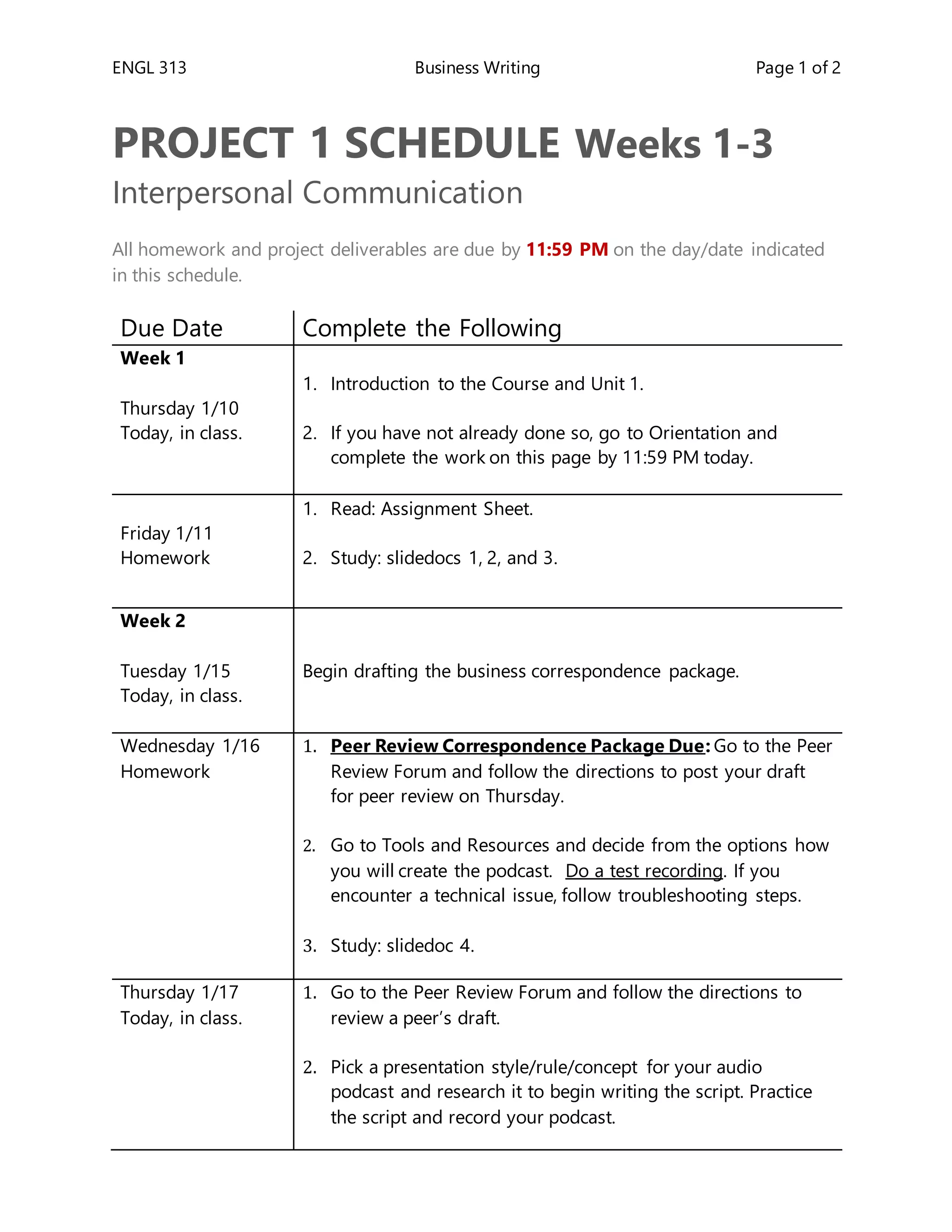 This document outlines the schedule and assignments for Project 1 of the ENGL 313 Business Writing course over 3 weeks. It details the homework, in-class activities, and deadlines for each week. Students will draft a business correspondence package, get peer reviews, and create an audio podcast on a business writing topic. They will revise all deliverables based on peer feedback and submit them by the final deadline of Sunday January 27th. Late submissions will receive point penalties.