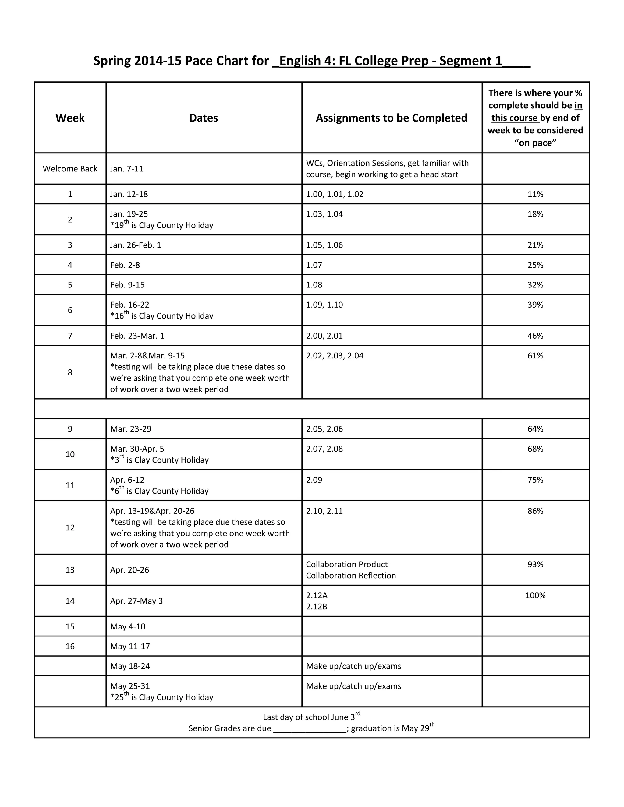 This document provides the pace chart for an English course segmented into 15 weeks. It outlines the assignments and readings that should be completed each week to stay on pace to finish the course. Students are expected to be 11% completed after the first week, 18% after the second week, and progressing linearly to be 100% completed by week 14. The chart also notes county holiday dates where less work may be assigned for that week.