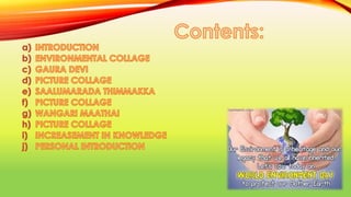 Gaura Devi was born in 1925 in a village in the Himalayan region of India. As a young girl, she learned from her mother about the importance of trees in preventing landslides and providing for the community. As an adult, Gaura Devi led the Chipko movement in 1974, where women hugged trees to prevent them from being cut down. The movement was successful in preventing lumbermen from cutting trees. Gaura Devi worked to educate villagers about the importance of preserving forests and advocated that cutting too many trees could destabilize the land. She drew on traditional Hindu teachings about living in harmony with nature. Gaura Devi played a key role in launching the Chipko movement and empowering women to protect forests.