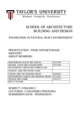 This document contains a research proposal summary from a group of students on two restaurants in Malaysia - Banyonya Restaurant in Melaka and The Scene Restaurant in Shah Alam. The group conducted interviews and research on the restaurants. Some key findings include: Banyonya Restaurant has operated for 13 years and focuses on Nyonya cuisine. The Scene Restaurant serves buffet-style Malay dishes and has faced competition but remained successful due to location and food quality. The group analyzed aspects of the businesses such as history, operations, finances, competition and food offerings to compare the two restaurants.