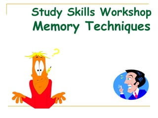 This document discusses various techniques for improving memory. It describes the different types of memory, including semantic, implicit, remote, working and episodic memory. It then outlines strategies that are effective for different learning styles, such as visual, auditory and haptic learners. The document also explains the four stages of memory: attention and selection, encoding, storage, and retrieval. Finally, it provides over 20 specific memory techniques including creating associations, writing things down, using mnemonic devices, reviewing information and limiting distractions.