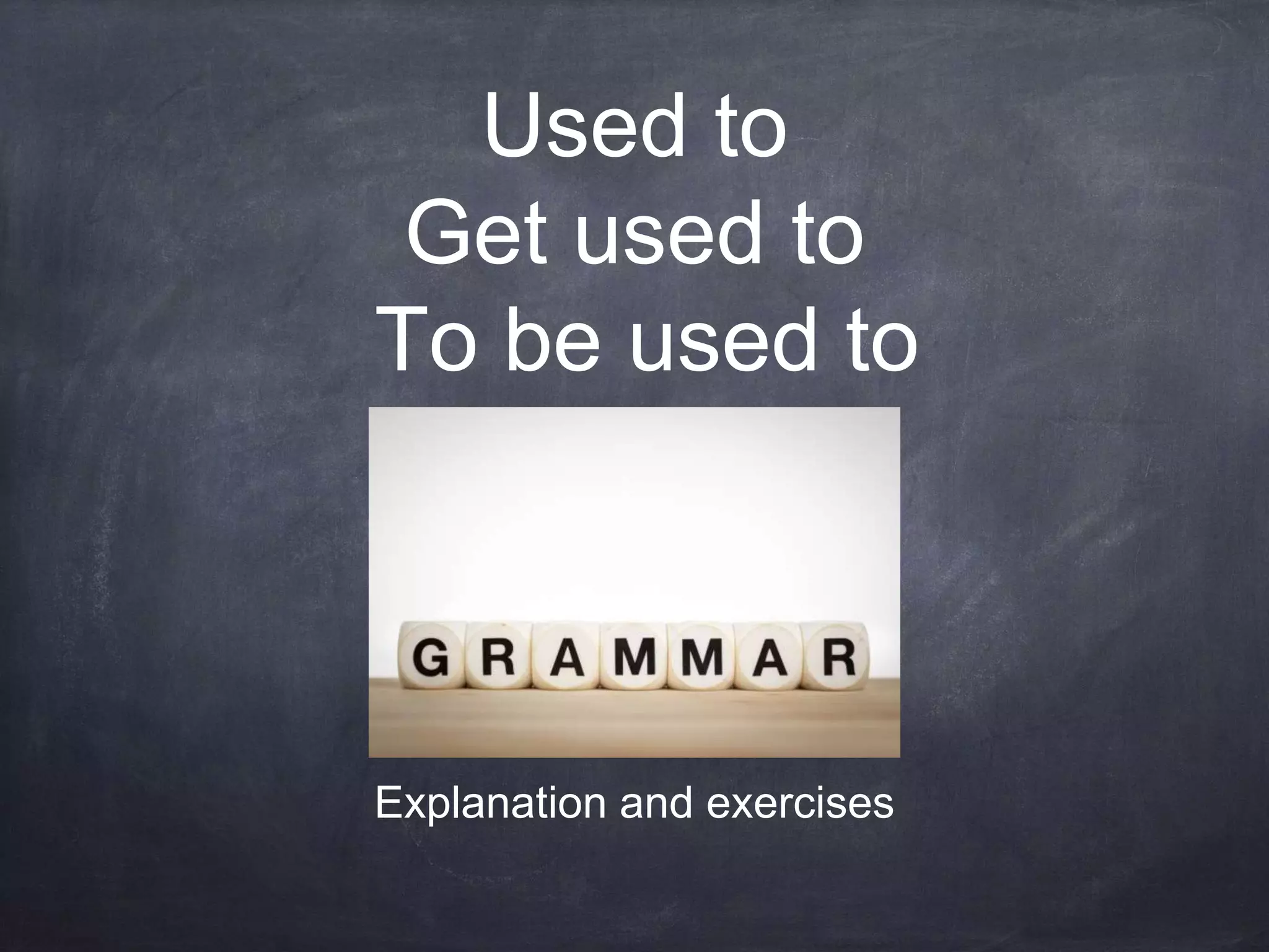 The document discusses the phrases "used to", "get used to", and "be used to". "Used to" indicates something happened regularly in the past but no longer does. "Get used to" means becoming accustomed to something new or different. "Be used to" refers to something being normal or usual. Examples are provided for each phrase.