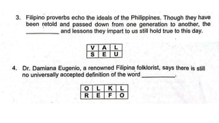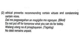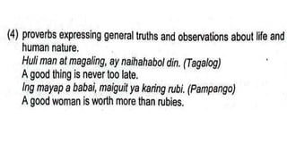 This document provides an overview of Filipino proverbs and their importance. It discusses the study of phonetics and the different types of sounds in language. It then focuses on the work of Damiana Eugenio, who collected many Filipino proverbs and categorized them. She found that proverbs reveal the wisdom of elders and teach lessons through short, poetic sayings. They prescribe norms and impart lessons on traditions and values. Eugenio classified proverbs into categories like those expressing views on life or recommending virtues. The document concludes with examples of proverbs that fit Eugenio's different categories.