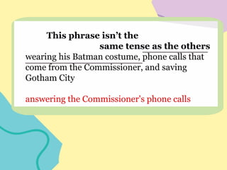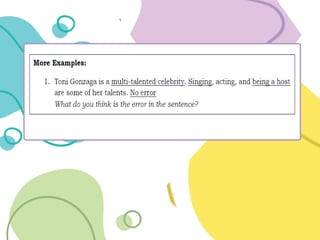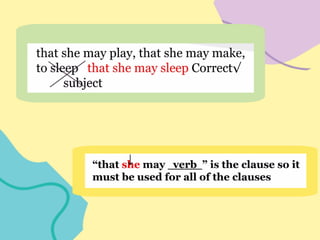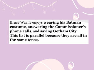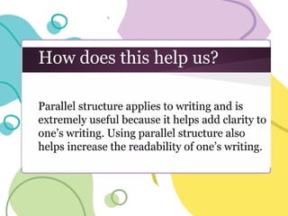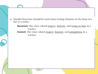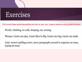 The document outlines rules for using parallel structures in writing. It highlights the importance of joining parallel structures with conjunctions and mentions that both clauses are correct. An example provided illustrates the proper use of parallel structures in a sentence.
