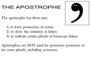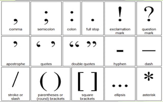The document outlines the various uses of punctuation marks, emphasizing their role in creating clarity, organization, and understanding in writing. It details how different punctuation, such as periods, commas, and quotation marks, function in sentences, including their usage in lists, separating clauses, and indicating strong emotions. Additionally, it explains specific punctuation like colons, semi-colons, ellipses, and hyphens and their respective roles in writing.
