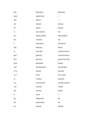 Le document présente une liste d'abréviations, de sigles et d'apocopes utilisées en anglais et en français. Chaque abréviation est accompagnée de son équivalent dans l'autre langue, ainsi que des précisions sur leur usage. Il souligne également les différences entre abréviations, sigles et apocopes.