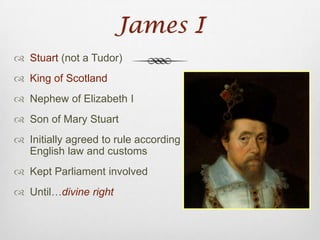 English Absolutism under James I and Charles I led to tensions with Parliament over taxation and religious policies. Charles I dissolved Parliament and attempted to rule without it, angering them. This resulted in the English Civil War between the Royalist Cavaliers and the Parliamentarian Roundheads led by Oliver Cromwell. Cromwell defeated the Cavaliers and had Charles I executed. England then became a republic under the Puritan-led Commonwealth before the monarchy was restored with Charles II, though it was now limited by the Petition of Right and Bill of Rights.